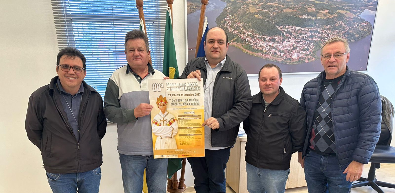 Marcelino Ramos se prepara para receber a 88ª Romaria de Nossa Senhora da Salette, que acontecerá no mês de setembro. Na tarde desta segunda-feira, o reitor do Seminário, o padre Renoir Dalpizol, acompanhado pelos padres Jean Costa e Claudir Costenaro, visitou o gabinete do prefeito Vannei Mafissoni e do vice-prefeito Claudemir Schnneider.