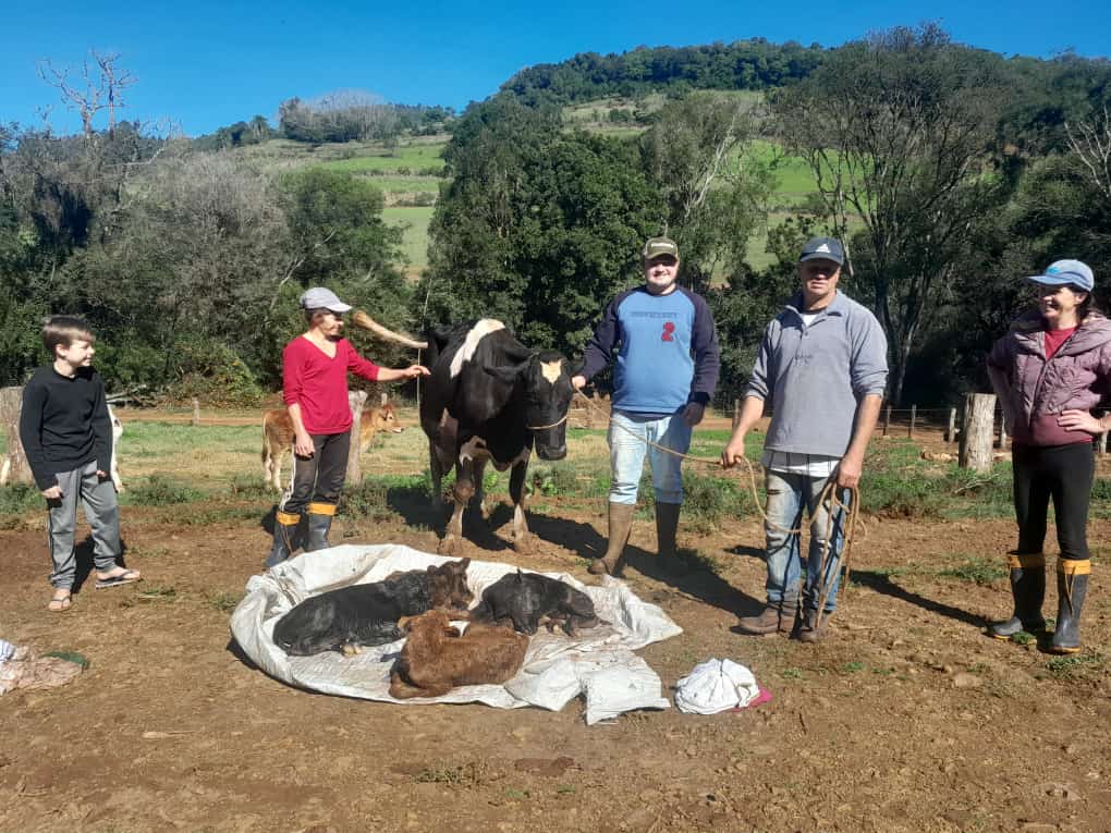 “Eram 8 horas da manhã quando notei que a vaca tinha parido um dos bezerros. Aguardei, veio o segundo, mas era pequeno e a barriga da vaca ainda estava grande”, contou Kurcezski. Os dois animais de cor preta e dois com pelagem vermelha vieram de inseminação artificial com a utilização do touro da raça Angus.