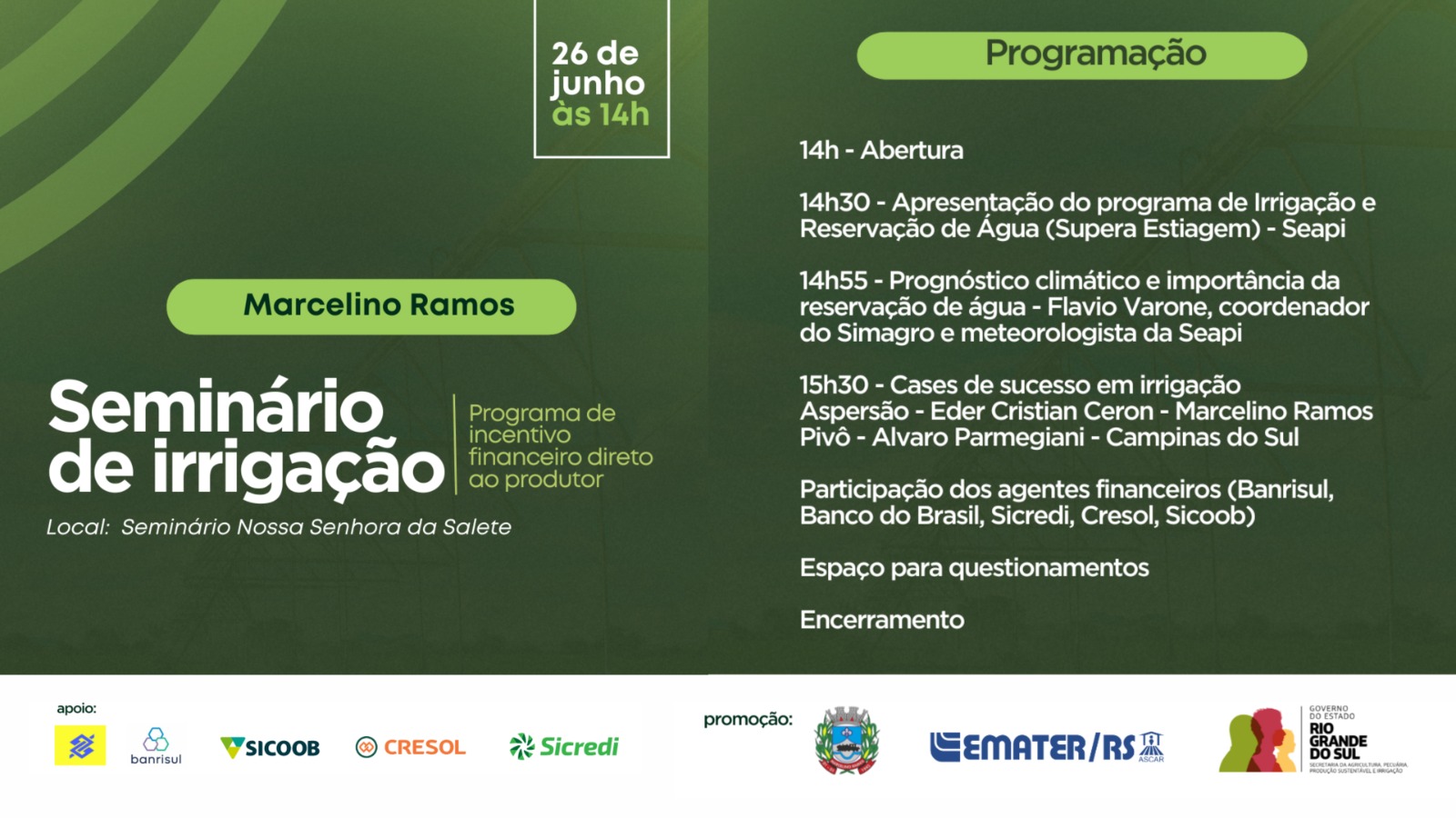 Na próxima semana (26), o município de Marcelino Ramos vai sediar o Seminário Regional de Irrigação, no Seminário Nossa Senhora da Salete. O evento pretende apresentar o Supera Estiagem, programa de Irrigação e Reservação de Água com Subvenção do Estado, através da Secretaria da Agricultura, Pecuária, Produção Sustentável e Irrigação (Seapi), para a comunidade, agricultores, parceiros e autoridades da região de Erechim.