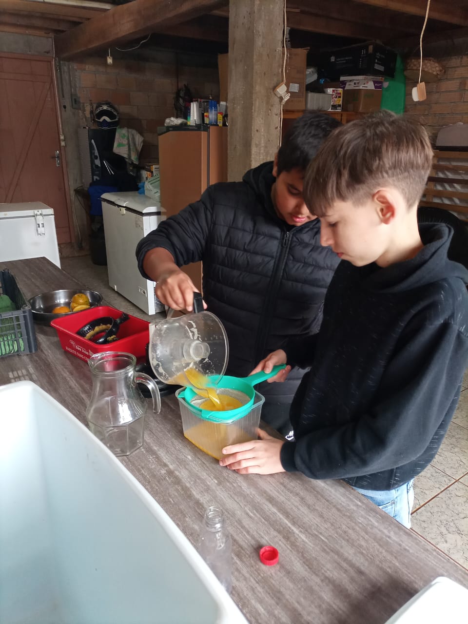 Os conhecimentos expostos pelos professores em sala de aula acenderam a criatividade dos alunos Murilo Esmael da Silva, 12 anos, e Bruno Peracchi, 13 anos, em criar um empreendimento sustentável e lucrativo. Os dois estudantes do 6º e 7º anos, da Escola Nossa Senhora das Graças, estão produzindo suco de laranja para vender na comunidade onde moram em Vila Suzana, interior de Marcelino Ramos.