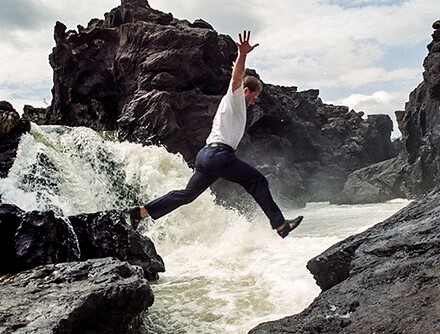 Um ato de bravura desafiando as águas turbulentas que guardavam segredos e perigos. Num equilíbrio entre audácia e precisão, um homem desafiava os limites da física, saltando de uma rocha para outra.