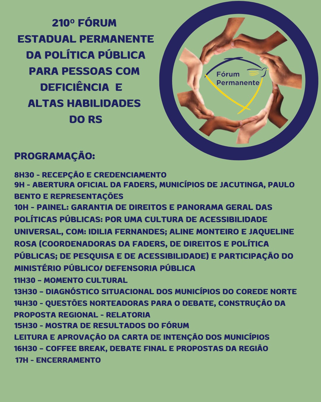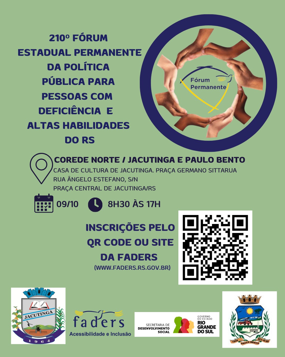 O município de Jacutinga recebe, no dia 9 de outubro, a 210ª edição do Fórum Permanente da Política Pública Estadual para Pessoas com Deficiência e Pessoas com Altas Habilidades – COREDE Norte. O evento é promovido pela Fundação de Articulação e Desenvolvimento de Políticas Públicas para Pessoas com Deficiência e Altas Habilidades no Rio Grande do Sul (FADERS), em parceria com o COREDE Norte e os municípios de Jacutinga e Paulo Bento.