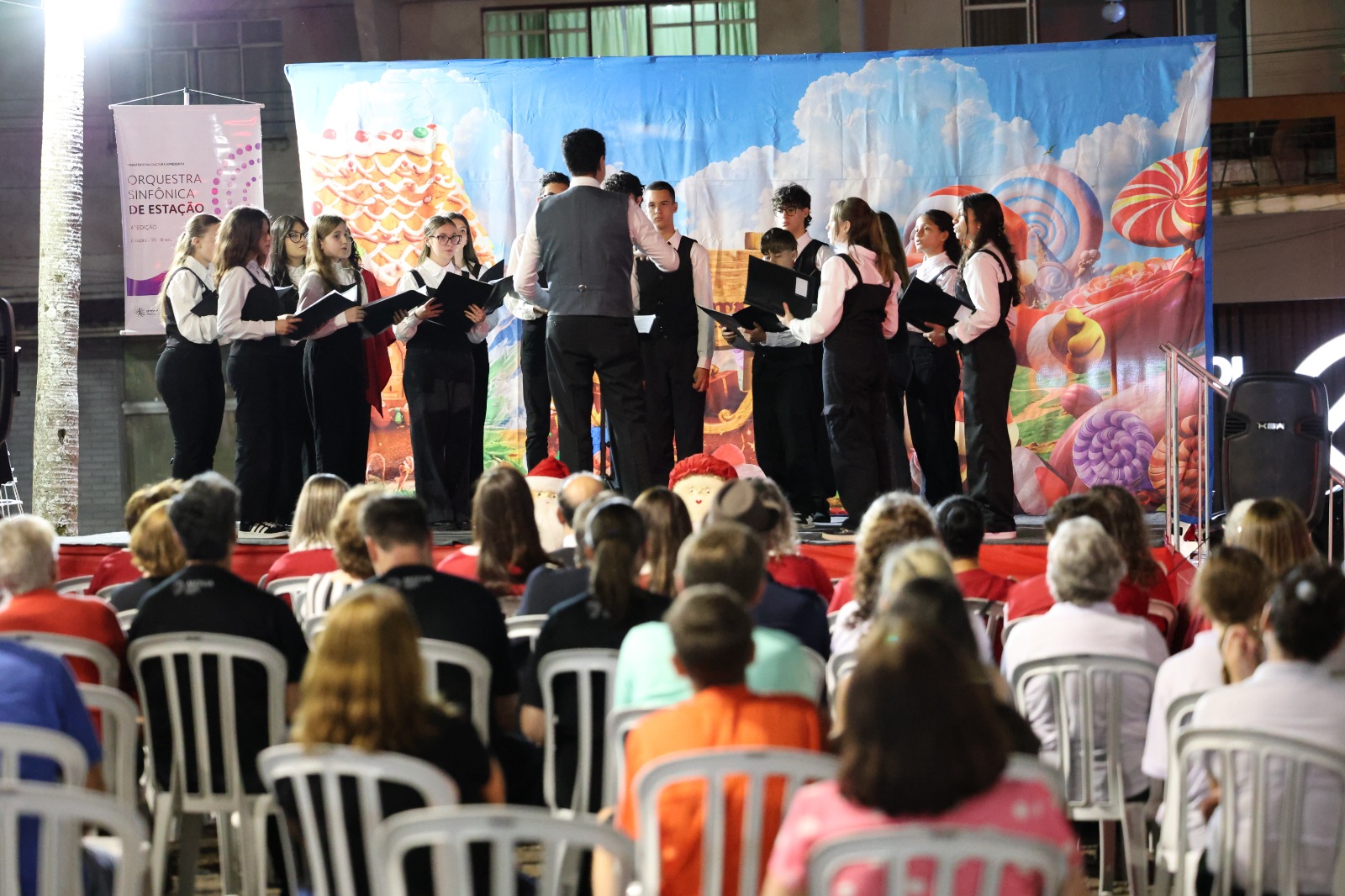 A cerimônia contou com apresentações de corais convidados, que conduziram a abertura da programação. A chegada do Papai Noel, em trenó, foi o momento mais aguardado da noite, reunindo crianças, famílias e visitantes que acompanharam sua recepção.