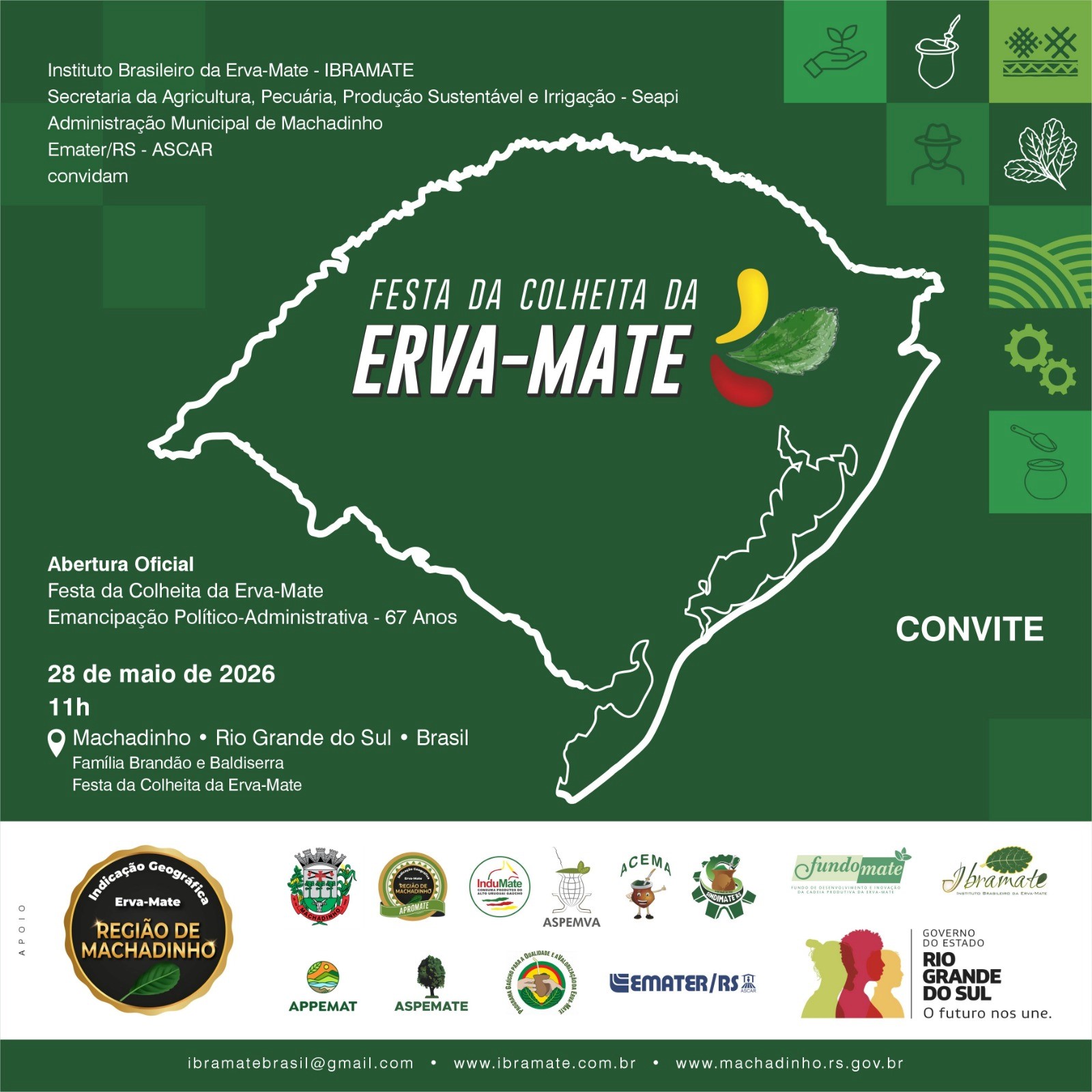 A Instituto Brasileiro da Erva-Mate, a Secretaria da Agricultura, Pecuária, Produção Sustentável e Irrigação do Rio Grande do Sul, a Prefeitura de Machadinho e a Emater/RS-Ascar promovem, no dia 28 de maio de 2026, a Festa da Colheita da Erva-Mate, em Machadinho. A programação está prevista para iniciar às 11h e integra a abertura oficial da colheita da cultura no Rio Grande do Sul.